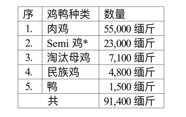 向这鸡鸭市场输送出产品的是仰光省、伊洛瓦底省及勃固省内的鸡鸭饲养人员们。前一个时期由于养鸡人员们获得的雏鸡减少,因而影响到10月初进入仰光市的肉鸡量减少,直到10月最后一周才恢复正常,进入仰光大都市的鸡鸭才增加到每天9万缅斤的数量了。