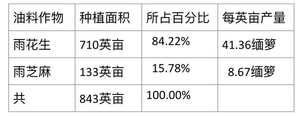雨油料作物只种植了雨花生及雨芝麻这两种,其中雨花生种植面积占了六分之五以上,芝麻种植面积不到六分之一。