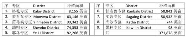 这雨花生在9个专区内共种植371,878英亩,各专区内种植的雨花生面积如下表: