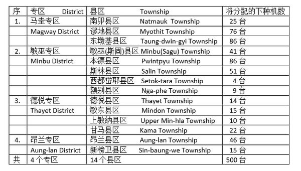 马圭省内各专区及县区将获得的下种机数量如下表: