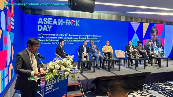 缅甸外交部常务秘书率领的缅甸代表团于 11 月 25 日至 27 日在泰国曼谷参加了由泰国和韩国外交部共同主办的以“加强东盟-韩国创意经济伙伴关系”为主题的东盟-韩国日。