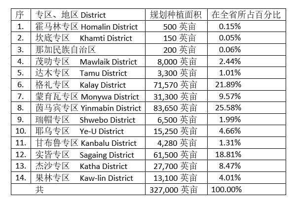 14个专区地区中,以茵马宾专区规划种植面积为最多,占全省这冬向日葵规划种植面积的 ¼ 以上的比例。格礼专区规划种植面积位居第二,超过全省规划种植面积的五分之一的比例;实皆专区规划种植面积位居第三。其余专区地区的规划种植面积就在32,000英亩以下了。