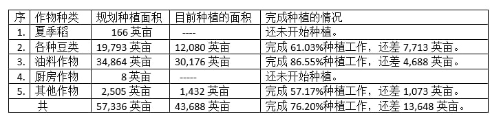 规划种植的各种作物中,以油料作物种植面积为最多,其次是是各种豆类。目前完成种植面积最多的也是油料作物。