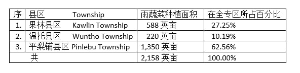 按:果林专区今年雨作物种植季节期间也曾种植了雨蔬菜6,152英亩,有关种植情况见《缅华网》10月15日“缅甸新闻”栏目中的有关报导。
