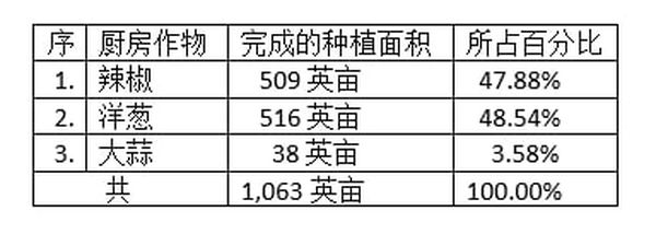 按:一些县区所种植的厨房作物,包括蔬菜作物在内,但现在本漂县区的厨房作物显然不把蔬菜作物计算在内。现在种植的厨房作物只有三种,以辣椒及洋葱为主,大蒜种植面积只占一个零头而已。