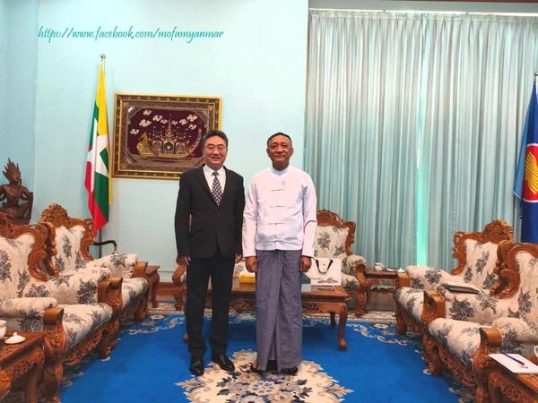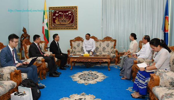 12月9日上午10时30分,缅甸外交部副部长吴哥哥觉( ဦးကိုကိုကျော်)在内比都外交部接见了正在访问缅甸的中国—东盟中心秘书长史忠俊及代表团成员。