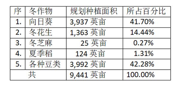 规划种植的各种冬作物中,以各种豆类种植面积为最多,其次是向日葵,这两类作物种植面积都各占全部种植面积40%以上的比例。