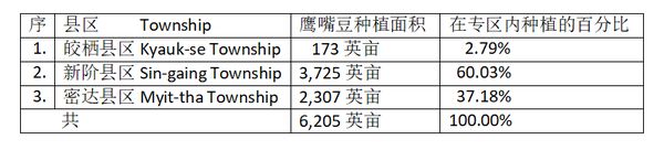 据12月10日出版的《缅甸之光报》报导,曼德勒省皎栖(Kyaukse)专区当地民众们依据季节情况种植各种庄稼作物,今年冬作物种植季节期间就在3个县区内种植了鹰嘴豆6,205英亩,这是由专区农田地产税务局方面获知的讯息。专区内各县区内目前鹰嘴豆的面积如下表: