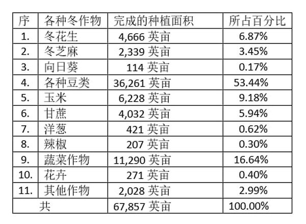 规划种植的各种冬作物中,以各种豆类规划种植面积为最多,占全部冬作物规划种植面积的一半以上以上,其次是蔬菜作物,占全部冬作物规划种植面积的近六分之一的比例。期望这些作物种植工作都能顺利完成并获得好收成,为农民们带来一定的收益。