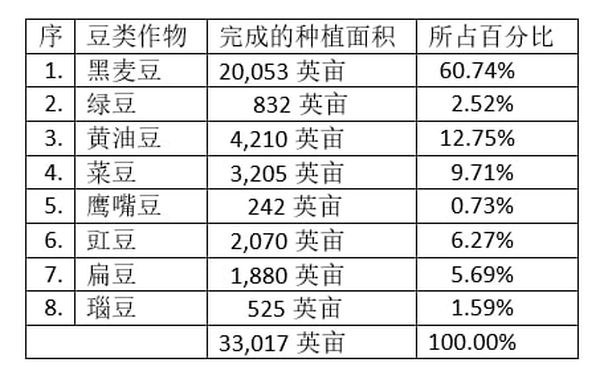 完成种植工作的豆类中,以黑麦豆种植面积为最多,占了所有豆类种植面积的五分之三还多。其次是黄油豆,占了所有豆类种植面积的八分之一以上的比例。位居第三的是菜豆,占了所有豆类种植面积的近十分之一的比例。此外规划种植面积较多的豆类还有豇豆及扁豆,规划面积就在2千英亩左右。其余豆类的规划种植面积都在1千英亩以下了。