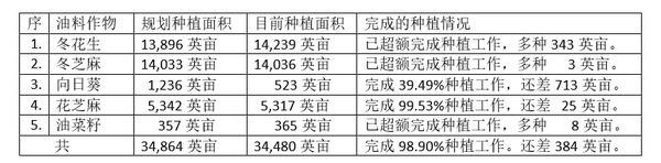 各种油料作物中,以花生及芝麻的种植面积为最多,目前这两种油料作物都已完成规划种植面积,甚至还超过。油菜籽也完成了规划种植面积,多种了8英亩。花芝麻作物是接近完成规划种植面积,只有向日葵目前种植面积与规划面积还相差甚远。