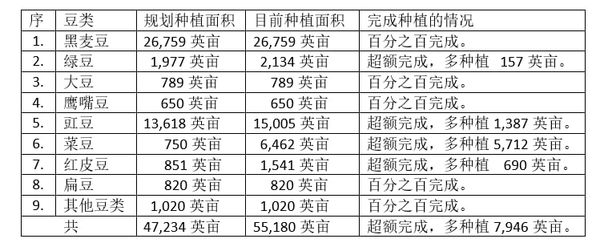 县区内规划种植的各种豆类面积及目前完成的各种豆类种植面积如下: