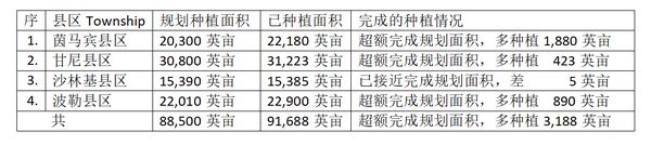 茵马宾专区内的四个县区为:茵马宾县区、甘尼(Kani)县区、沙林基(Salingyi)县区及波勒(Pale)县区,各县区原规划的木豆种植面积及实际所完成的种植面积如下表: