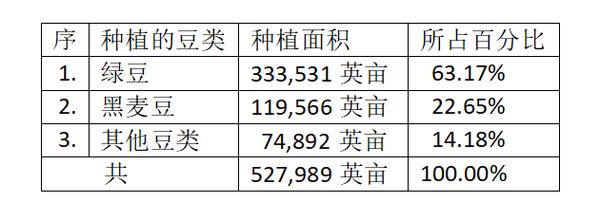种植的豆类中,已绿豆种植面积为最多,占所有豆类种植面积的八分之五以上的比例,其次是黑麦豆,种植面积超过所有豆类种植面积的五分之一以上。
