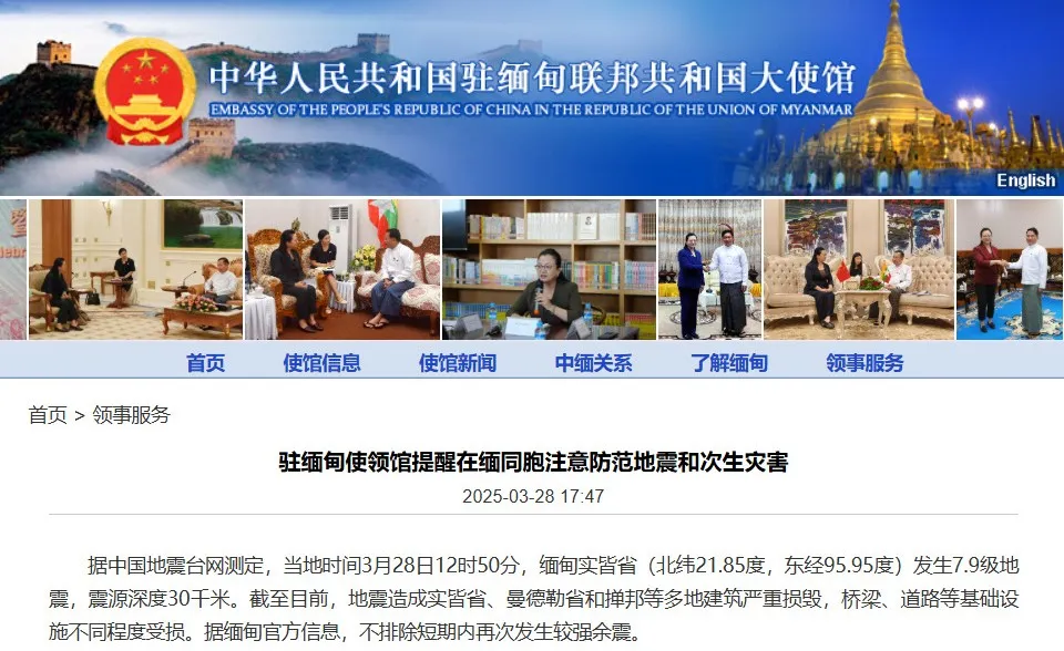 中国驻缅甸使领馆已启动应急机制,密切关注地震灾情和在缅同胞受灾情况并开展应对工作。为确保在缅同胞人身财产安全,中国使领馆方面提醒侨胞: