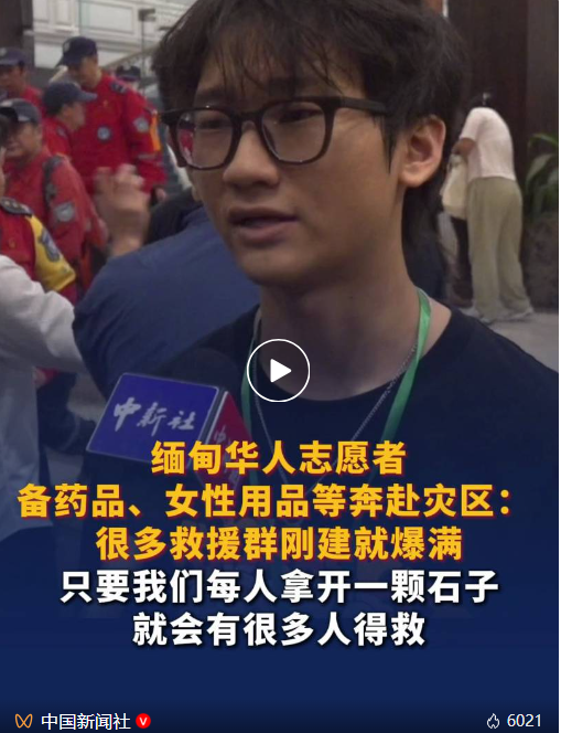 缅甸当地华人:28日地震发生得很突然,看到新闻说第一天就有近百人的伤亡,我们也是很痛心,想出自己的一份力,所有的华人都在努力地帮忙建微信群传播消息,然后再组织起来去救援。我们找到了为我们捐赠物资的团队,他们捐赠的物资有一些女性用品,一些酒精、纸尿布之类的医疗和生活用品,还有一些食品,以及救援队所需要的安全用品、照明灯。现在这些物品在曼德勒非常急需。我们也希望大家如果有这些物资,可以快点送到灾区,现在真的非常紧急。非常感谢大家。