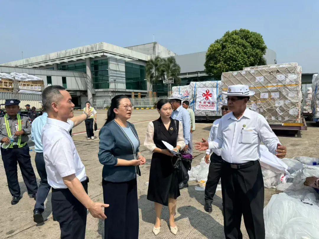 当地时间3月31日12点15分,中国政府向缅甸提供的首批紧急人道主义救灾物资运抵仰光国际机场。中国驻缅甸大使马珈、仰光省首席部长梭登、使馆欧阳道冰参赞等赴机场迎接……