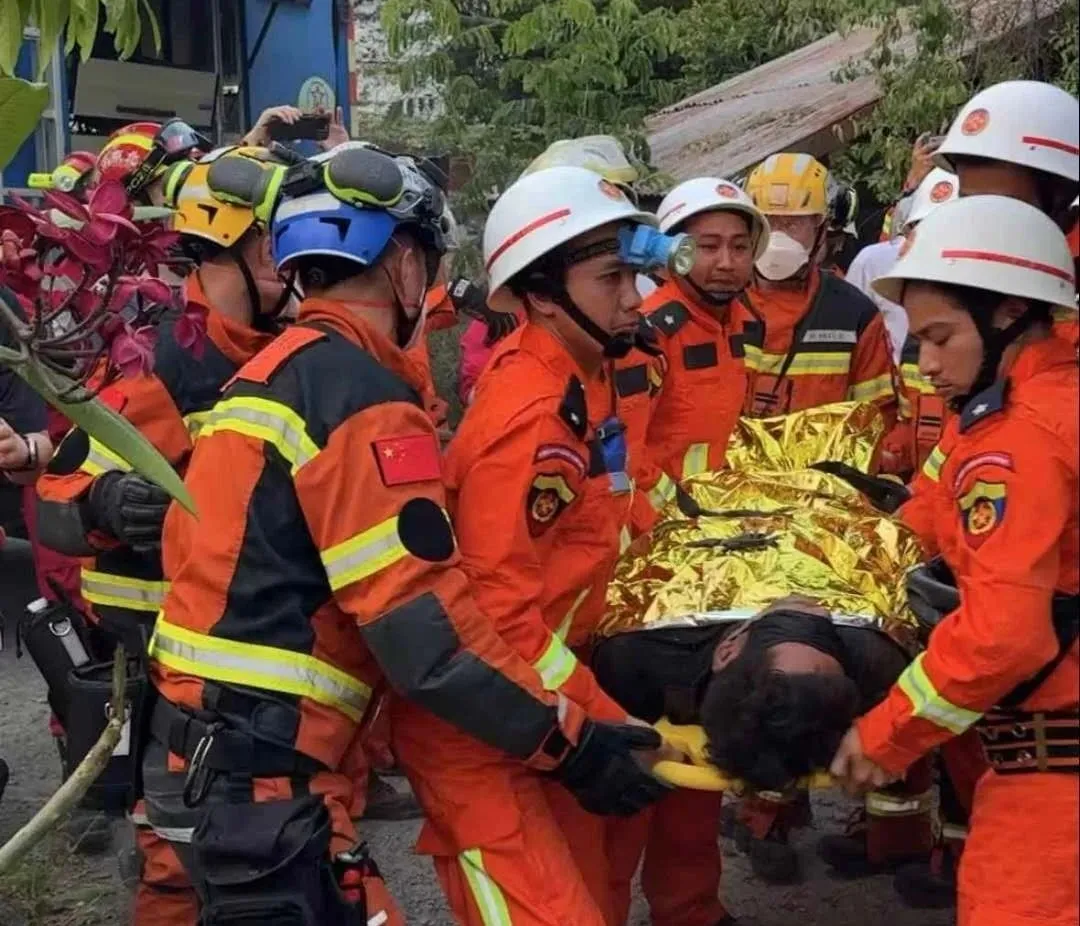 2025年4月2日下午17:50,中国救援队与缅甸救援队一起,在曼德勒市区65条街,31与32条街中间的Golden Country酒店坍塌瓦砾堆中救出一名生还者。