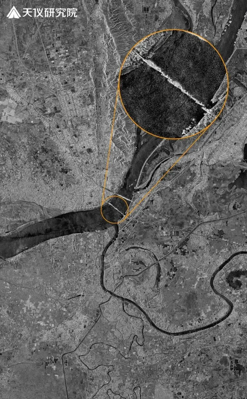 在卫星遥感领域,合成孔径雷达(Synthetic Aperture Radar, SAR)卫星擅长突破环境限制,尤其在地震应急响应中有其独特价值。地震发生后,天仪研究院迅速启动应急观测模式,获取了震区的 SAR 影像。例如在影像中,伊洛瓦底江上的阿瓦大桥结构性损毁清晰可见。