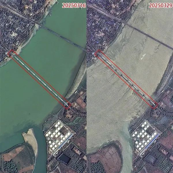 图 3:缅甸地震受灾前后光学卫星图像(灾前:高分一号 03 卫星 2025 年 3 月 16 日采集,灾后:资源一号 02D 卫星 2025 年 3 月 29 日采集)
