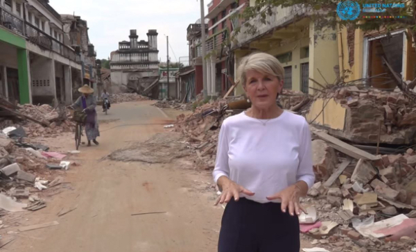 此外,联合国于4月10日发布了一段视频,记录朱莉·毕晓普与地震灾区民众的会面情况。视频中,她指出灾区急需药品、清洁饮用水和临时庇护所。