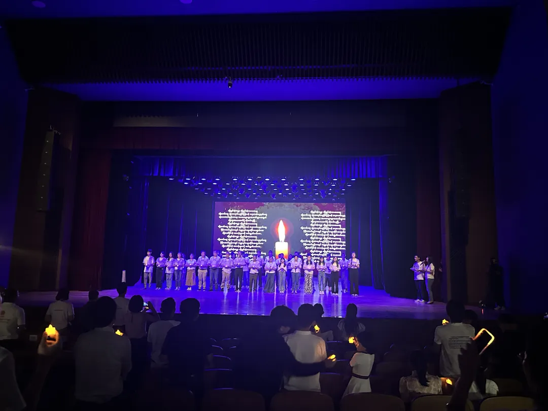随后,以“保护大自然、团结互助”为主题的小品演出,引导大家珍惜大地、珍视人与人之间的相互支持。在全场齐声合唱《明天会更好》的歌声中,大家一盏一盏地点亮蜡烛,微微的亮光慢慢汇聚在一起,传递着温暖和凝聚力。紧接着,所有参与者手持蜡烛大合唱《We Are The World缅文版》,场面温馨动人。