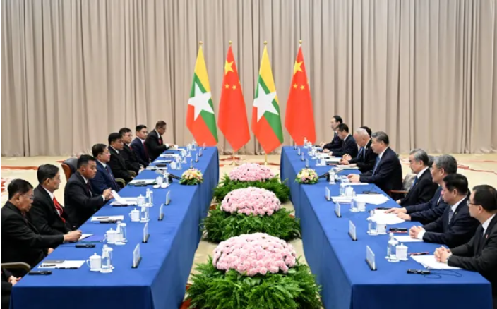 习近平指出,中缅是同甘共苦、守望相助的命运共同体。中缅两国共同倡导的和平共处五项原则和万隆精神历久弥坚,时代价值不断凸显。今年是两国建交75周年,中方将秉持睦邻、安邻、富邻、亲诚惠容、命运与共的理念方针,同缅方深化命运共同体建设,高质量共建“一带一路”,落实好全球发展倡议、全球安全倡议、全球文明倡议,给两国人民带来更多福祉。前不久,缅甸曼德勒强烈地震造成重大人员伤亡和财产损失,中方最早派出救援力量,援助紧急人道主义物资,愿继续提供帮助,支持缅方重建家园。中方支持缅甸走符合本国国情的发展道路,维护主权独立、领土完整、国家稳定,稳妥推进国内政治议程。双方要深化战略合作,持续推进中缅经济走廊重点项目建设。希望缅方切实保障在缅中方人员、机构、项目安全,加力打击网赌电诈等跨境犯罪。双方要共同捍卫以联合国为核心的国际体系和以国际法为基础的国际秩序,维护发展中国家正当权益。