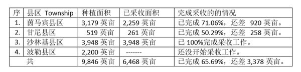 四个县区中,不论是种植面积,还是已完成的采收面积,都以沙林基县区为最多,而茵马宾县区次之。