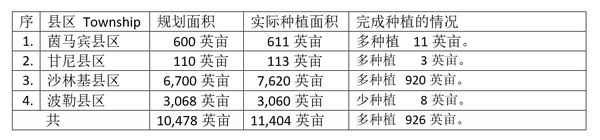 茵马宾专区内的4个县区—茵马宾县区、甘尼(Kani)县区、沙林基(Sa-lin-gyi)县区及波勒(Pale)县区规划种植的黑麦豆面积及目前完成实际种植的面积如下表: