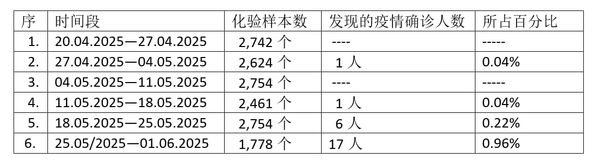 卫生部于6月2日晚上8点发出公告,在5月25日晚上8点是直到6月1日晚上8时这一周时间内,对1,784个化验样本进行检测,发现了17名新冠疫情确诊者。