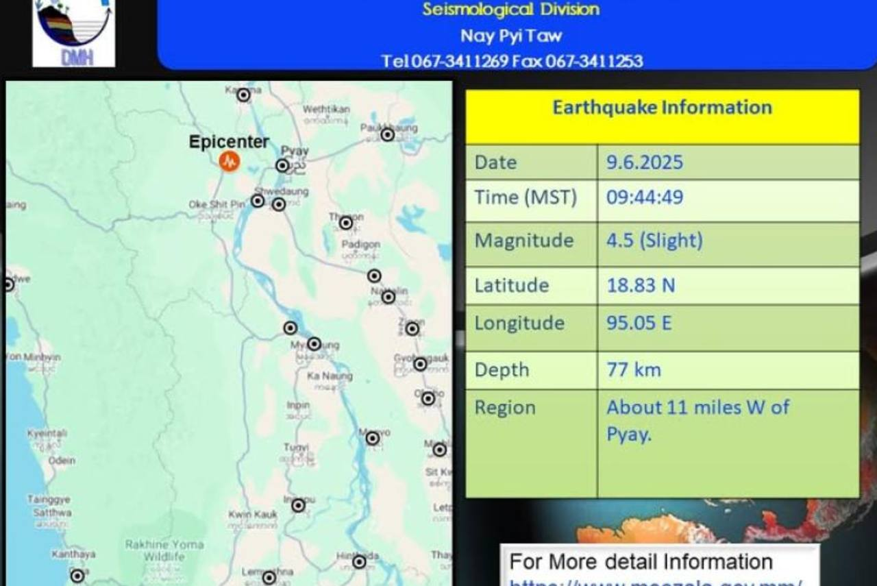 缅甸气象与水文局发布消息称,6月9日上午,卑谬(ပြည်မြို)附近发生里氏4.5级轻微地震。声明称,地震发生于缅甸时间上午9时44分左右,震中位于卑谬以西约11英里处(北纬18.83度,东经95.05度),震源深度77公里……