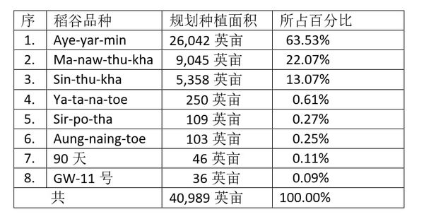敏巫(斯固)县区在现2025—26财政年度雨作物种植季节期间种植此雨季稻作物时,除了利用渠堰之水源在水田中种植此稻谷之外,也在望天田(依靠雨水种植的农田)采用各种方法获取有关农业用水种植了这些稻谷。现在县区内种植的稻谷品种也Aye-yar-min、Ma-naw-thu-kha、Sin-thu-kha、Ya-ta-nar-toe、Aung-naing-toe、90天、GW-11号等品种,各品种稻谷规划种植面积如下表: