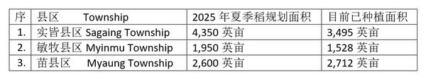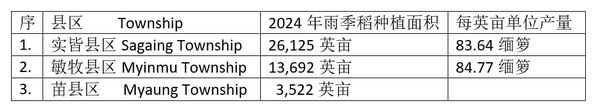 按:实皆省是上缅甸第一农业种植大省,实皆专区虽然不像下缅甸一些农业种植专区、县区等那样大种稻谷,但也尽其所能种植了一定的稻谷。实皆专区的3个县区在2024年雨季时期种植的雨季稻面积如下: