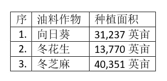 各种油料作物种植面积都是上万英亩,可见这是一个重要的油料作物种植地区了。