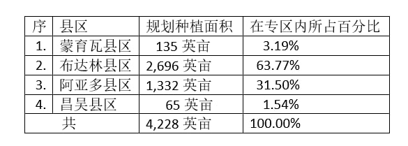 各县区中,以布达林县区规划种植的面积为最多,该县区规划种植的香蕉面积约占全专区规划种植面积的八分之五以上的比例,其次是阿亚多县区,该县区规划种植的香蕉面积接近全专区规划面积的三分之一。
