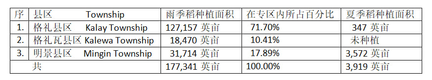 专区内的3个县区中,雨季稻以格礼县区种植的面积为最多,占了全专区种植面积的七成以上比例,而夏季稻种植面积以明景县区为最多,该县区夏季稻种植面积占全专区九成以上比例。而格礼瓦县区完全没见到有关种植夏季稻的报导,而该县区雨季稻种植面积也仅占全专区的一成比例。