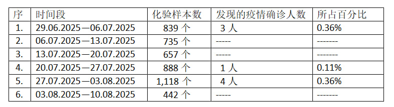 卫生部于8月11日晚上8点发出公告,在8月3日晚上8时直到8月10日晚上8时这一周时间内,对442个化验样本进行检测,没有发现任何新冠疫情确诊者。