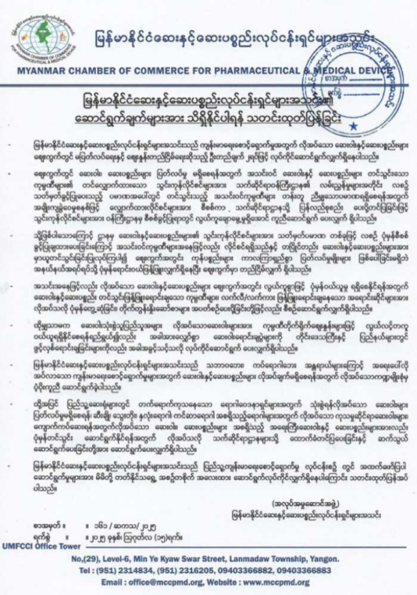 缅甸医药及医疗器械企业家协会发布声明称,正按规定数量每月定期审批药品和医疗器械的进口许可证。