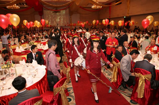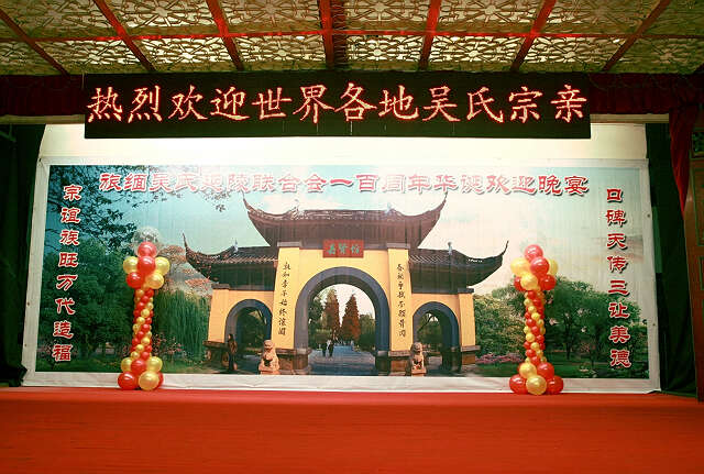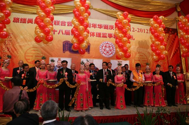 下午6:30时,假座仰光商贸大酒家大井宴席,来自香港、新加坡、马来西亚、印尼、泰国、中国、纽西兰、西班牙等地的吴氏宗亲代表们共120位,以及仰光各侨团代表、吴氏延陵联合会全体理监事和会员等出席了宴会,共开一百多宴席,场面极其热闹。首先,由巨轮社铜乐队进场祝贺、然后,舞龙队、舞狮队依次进场祝贺,仰光吴氏延陵联合会理事长首先致开幕词,接着世界吴氏总会会长以及来自世界各地的吴氏宗亲代表团团长也依次上台祝辞,彰显世界吴氏精诚团结;各代表团及缅甸华商商会、巨轮社、缅甸福建同乡总会以及仰光晋江公会的代表们分别敬送花篮、牌匾等,表示祝贺。