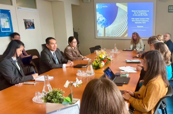 在国际原子能机构(IAEA)第69届大会期间,缅甸常驻维也纳联合国及其他国际组织代表吴敏邓大使(ဦးမင်းသိမ်း)与科学技术部原子能司总司长登基貌貌博士(သိင်္ဂီမောင်မောင်)于2025年9月18日上午11时30分在维也纳国际中心,与IAEA技术合作司亚洲太平洋处处长Ge Deng先生率领的代表团举行会谈。双方就2024-2025周期对缅甸技术援助计划的实施进展进行了讨论。