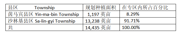 目前茵马宾专区内的4个县区—茵马宾县区、甘尼(Kani)县区、沙林基(Sa-lin-gyi)县区及波勒(Pale)县区中,只有两个县区规划种植此扁豆作物,各县区规划种植的扁豆面积如下表: