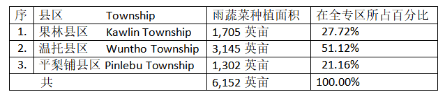 在现2025—26财政年度冬作物种植季节期间,果林专区内的各县区规划种植蔬菜作物共6,152英亩,各县区规划的种植面积如下表: