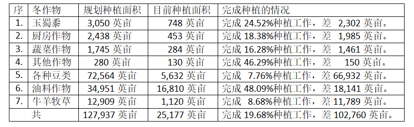 本漂县区今年冬季规划种植的各种冬作物的种植面积及目前完成的种植面积如下表: