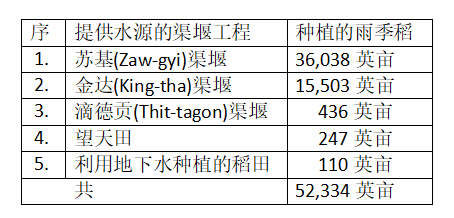 另外县区在今年雨季稻种植季节期间,利用了苏基(Zaw-gyi)渠堰、金达(Kingtha)渠堰、滴德贡(Thit-tagon)渠堰及望天田、地下水源等种植这些雨季稻,这是由县农业局方面获知的讯息。