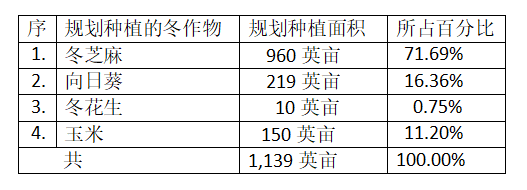稻谷收割后将继续种植冬作物,包括油料作物、玉米及厨房作物等。目前各种作物规划的种植面积如下表: