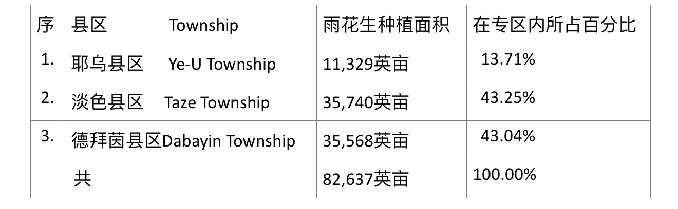 按:德拜茵所在的耶乌专区是一重要的油料作物种植地区,该专区内的各县区在今年雨季都种植了雨花生,各县区所种植的雨花生面积如下:
