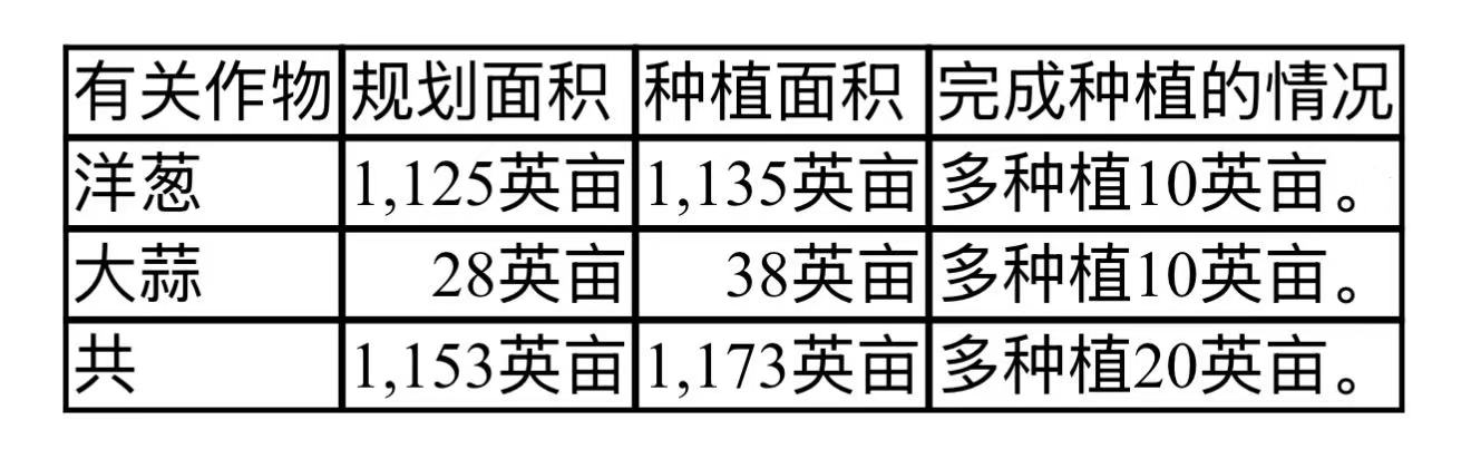 今年冬季本漂县区规划种植的洋葱大蒜种植面积及实际种植面积如下表: