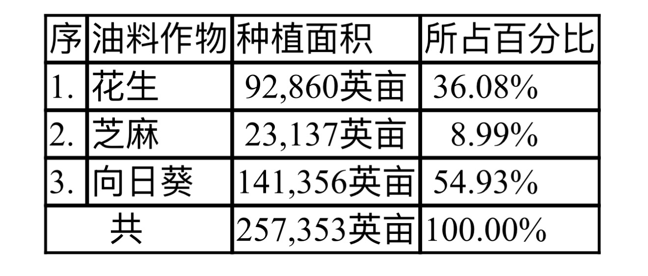 在过去的财政年度内,伊洛瓦底省内种植了油料作物花生、芝麻及向日葵共25万多英亩,省内食用油自给率达到38.43%,现财政年度内则将争取这食用油自给率能达到70%。去年各种油料作物的种植面积如下表: