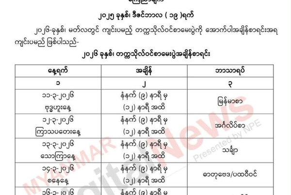 另悉,2026年大学入学考试报考申请表(每份200缅币)及考试费印花税票(价值700缅币)已自2025年9月1日至9月30日期间,在缅甸考试管理局总部,内比都办公楼52号及缅甸考试管理局仰光办事处,仰光省莱达雅镇区12街区,巴拉密路(ပါရမီလမ်း)发售。