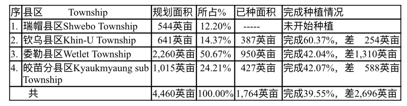 目前瑞帽专区各县区规划种植的利玛豆及已完成种植工作的面积如下表: